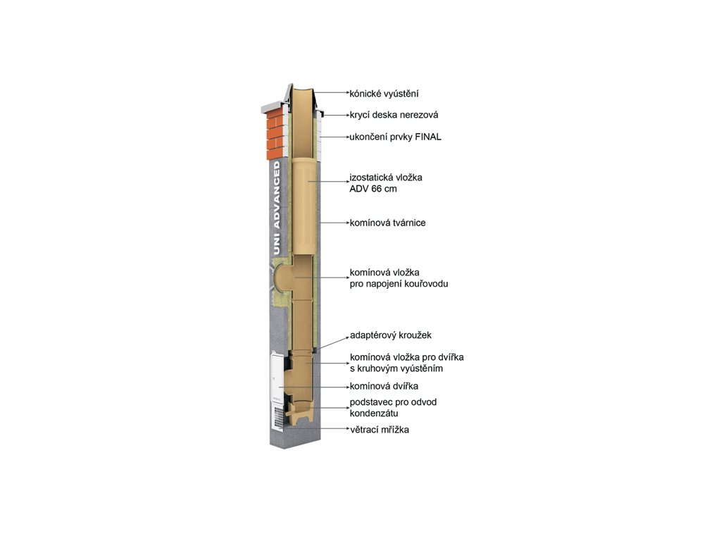 Komínová sestava Uni Advanced obsahuje: komínové tvárnice, komínové vložky, izolační rohože, komínová vložka pro kouřovod 90°, komínová pata, souprava komínové paty, maltová směs, krycí deska nerezová pro zateplení (přesah 8cm).